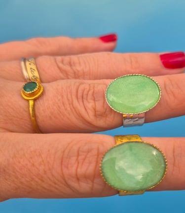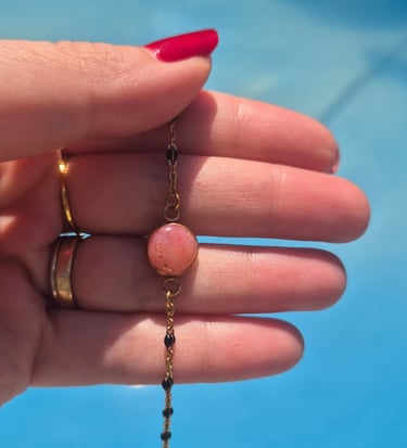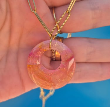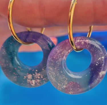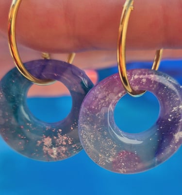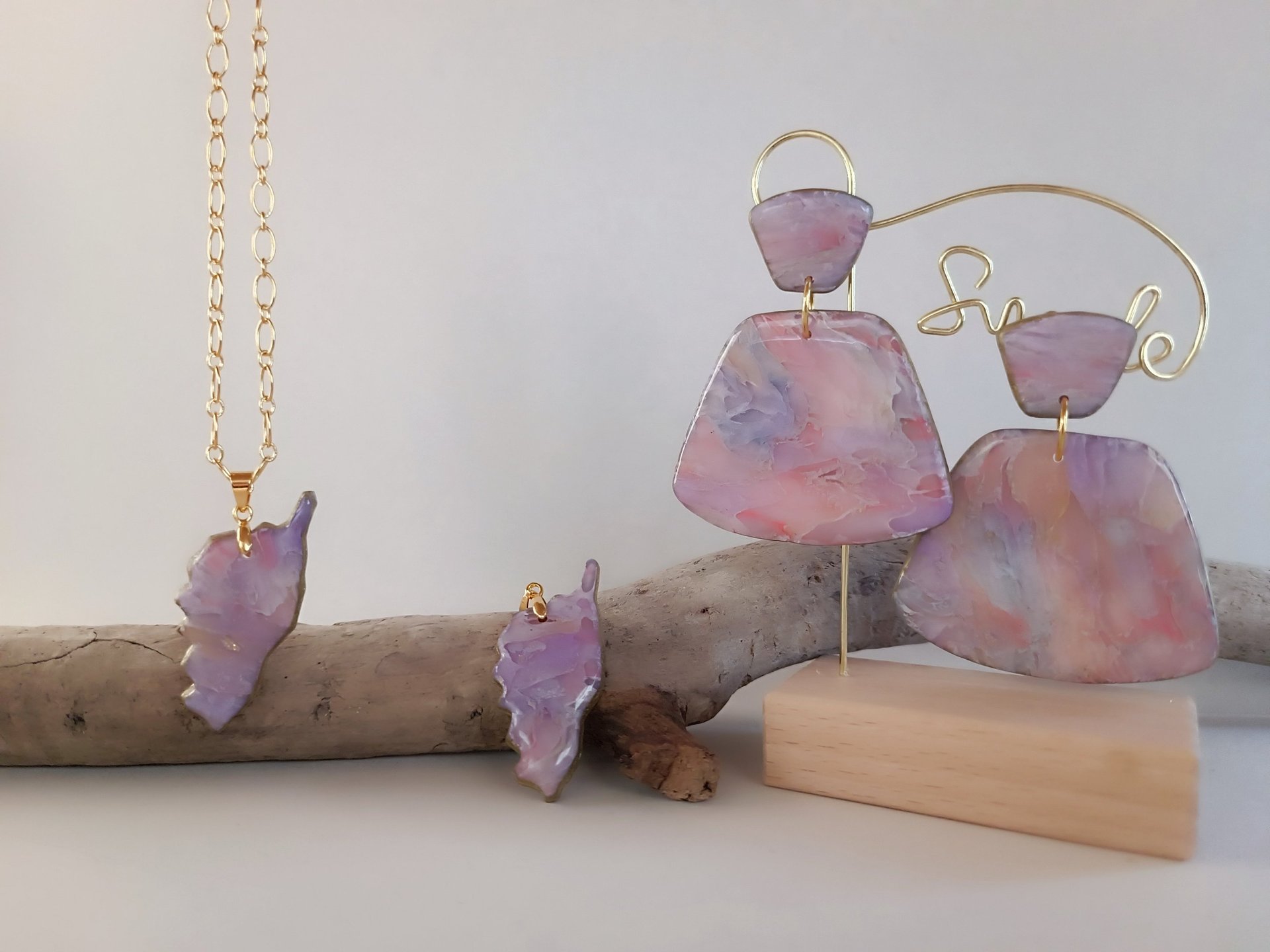 Je façonne mes créations en argile polymère, à laquelle j’ajoute parfois des poudres de mica naturel et de la peinture acrylique pour composer des mélanges de couleurs uniques. Pour la finition, j’utilise une résine de haute qualité, qui sublime les nuances et leur offre éclat et durabilité.